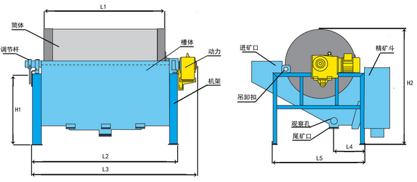 其原理是當(dāng)?shù)V漿進(jìn)入磁場區(qū)時(shí),其中強(qiáng)磁性礦物被吸附在圓筒表面,弱磁性和非磁性礦物被水流沖洗排出,而吸附在圓筒表面上的磁性礦物隨圓筒旋轉(zhuǎn),被帶出磁場區(qū),用沖洗水沖入精礦槽中,完成分選作業(yè)。