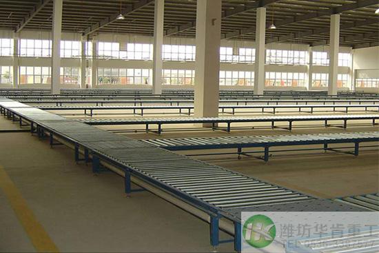 無動力輥筒輸送機:無動力滾筒輸送機又稱輥道線。依靠輥筒來完成輸送,適用于各類箱、包、托盤等件貨的輸送,散料、小件物品或不規(guī)則的物品需放在托盤上或周轉(zhuǎn)箱內(nèi)輸送。有長輥道和短輥道兩種。長輥道的輥子表面形狀有圓柱形、圓錐形和曲面形幾種,以圓柱形長輥道應用最廣。輥道的曲線段采用圓錐形輥子或雙排圓柱形輥子,可使物品轉(zhuǎn)彎。短輥道可以縮短輥子的間距,自重較輕。輥道一般稍下傾,當物品較重、線路較長時,為了推動物品時省力,斜度可取1~1.5%。如要使物品自滑,斜度可增大到2~3%。影響自滑斜度大小的因素很多,大多用實驗確定合適的角度。當線路長度小于10米、物品輕于 200千克時,可以布置成水平線路。自滑式輥道不易控制物品下滑速度,所以長度一般不大。輥道的寬度比物品寬度大100~150毫米。曲線段最小曲率半徑為輥道寬度的3~4倍。輥子間距為輸送物品長度的1/3~1/4,當物品輸送的平穩(wěn)性要求較高時。間距可取輸送物品長度的1/4~1/5。輥子直徑按載荷大小決定。